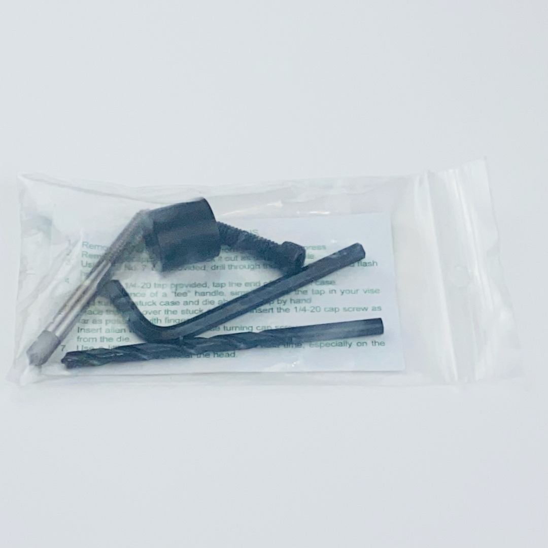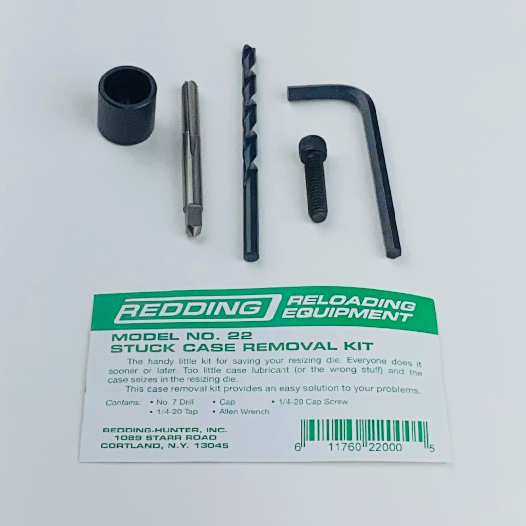 Kit Redding Stuck Case Removal — conjunto desenvolvido para remover com segurança estojos presos em matrizes de recalibragem. Inclui parafusos, bucha guia e extrator, permitindo extrair o estojo sem danificar a ferramenta. Ideal para recarregadores que buscam manutenção prática e confiável de suas matrizes.